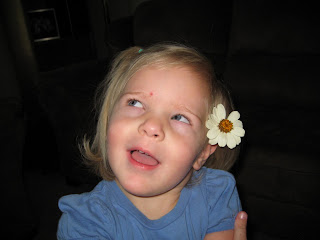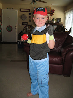 This morning we were playing outside and Mara picked this flower out of the garden. She was so cute and pulled off all of the leaves. She finally let me put it in her hair and this was the 'cutest' picture My mom went out shopping and found this costume for Xander. Looks like he will be Ash Ketchum from Pokemon for Halloween. (I can't get him to take the thing off, he's so happy!)