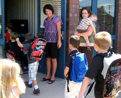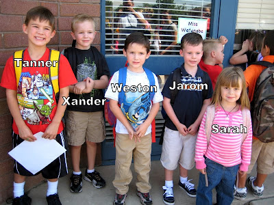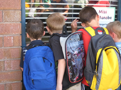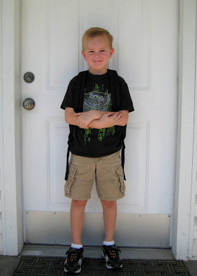 The day has finally come for Xander to be in Kindergarten!! It's been a long time coming, he's had 2 years of pre-school. He's one of the older ones in his class (he'll be 6 in October). He was so ready to go, that he almost left me in his dust!! I had to holler at him a few times to slow down on the walk over to the school :)