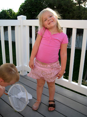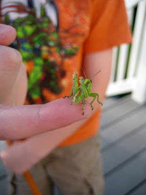 While Pat was mowing the lawn tonight, the kids were in the back playing. Xander found this tiny grasshopper and decided to play with him for awhile. I was amazed that it stayed on his hand! He held it for a good 10 minutes and was just so happy about it. He even tried to bring it inside a few times and we had to remind him to keep it outside.