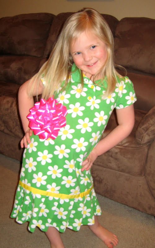 Here she is modeling a new dress she got from Grandma Tolman, and she had to put the bow from the top of the present on her dress too!