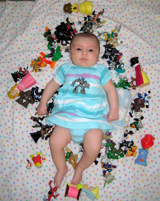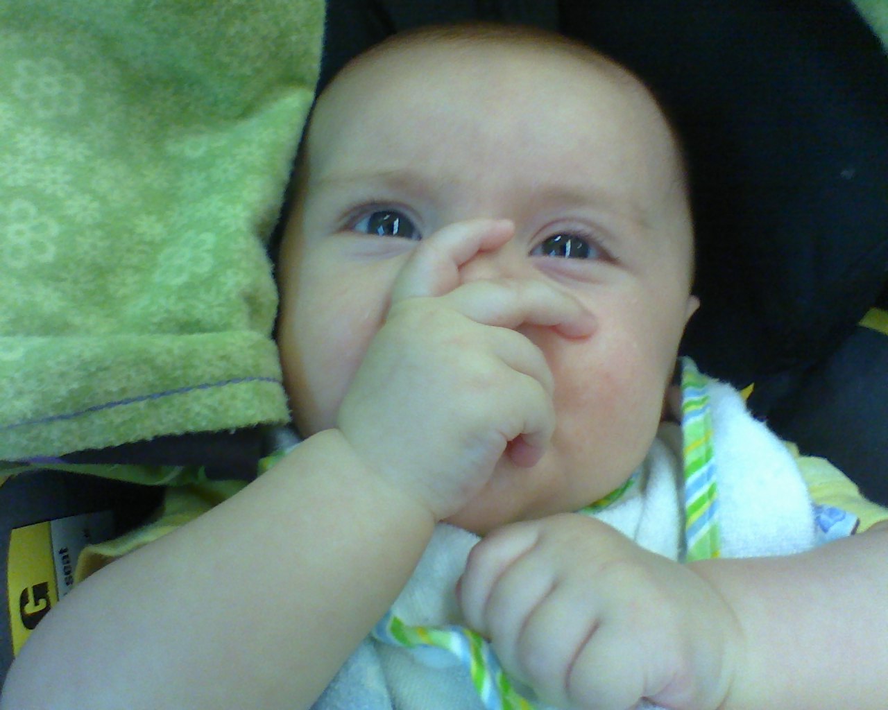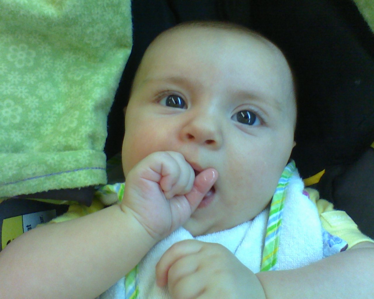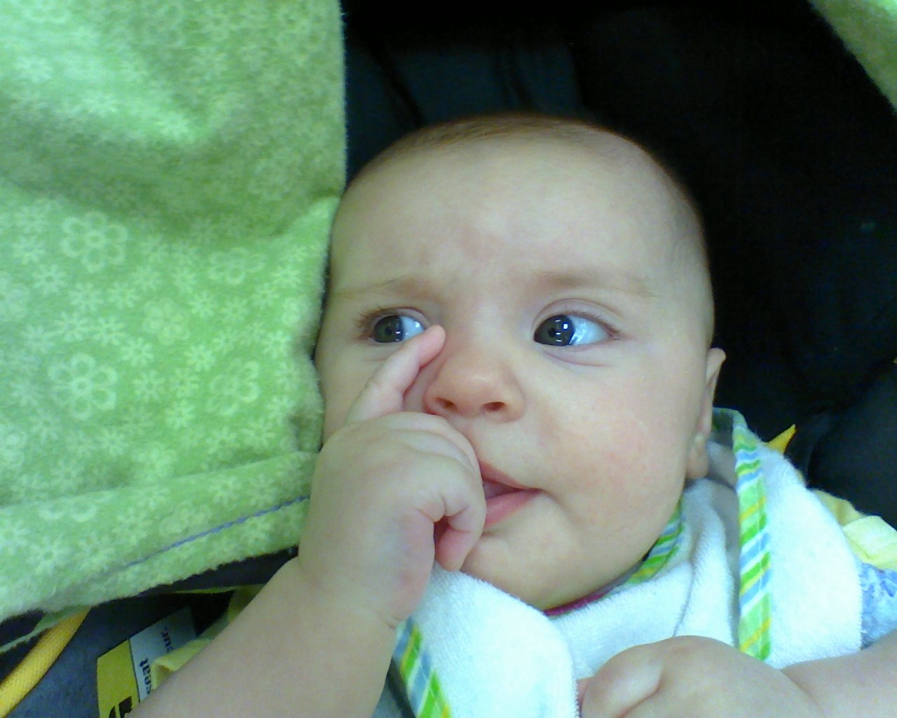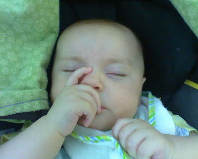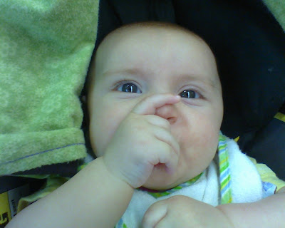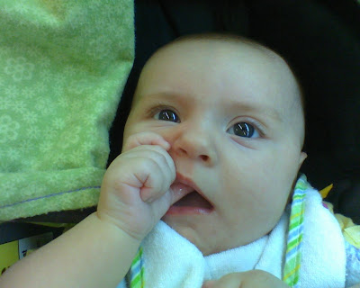 We went to the grocery store last night and it was right after I fed Jaina. She tends to take little naps after each feeding, and we forgot her binky (which she uses to fall asleep). When she doesn't have a binky she likes to suck/chew on her hands and last night she found her thumb a few times. So I got out my phone and took some pics of her. I wish I would have taken a video, because she makes the funniest noises when she has her hands in her mouth.