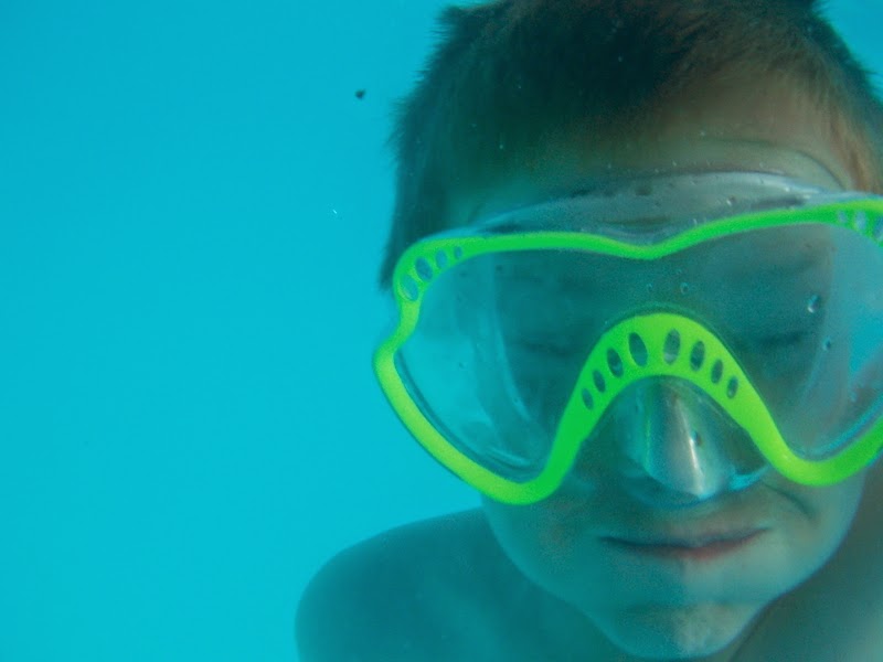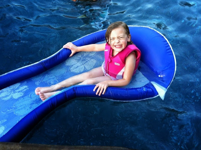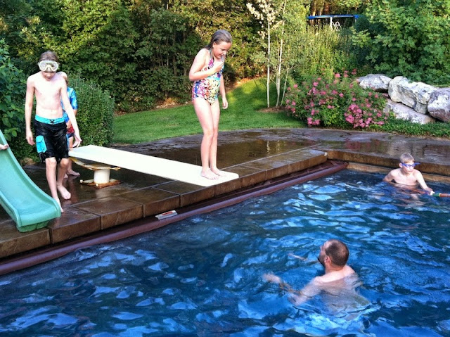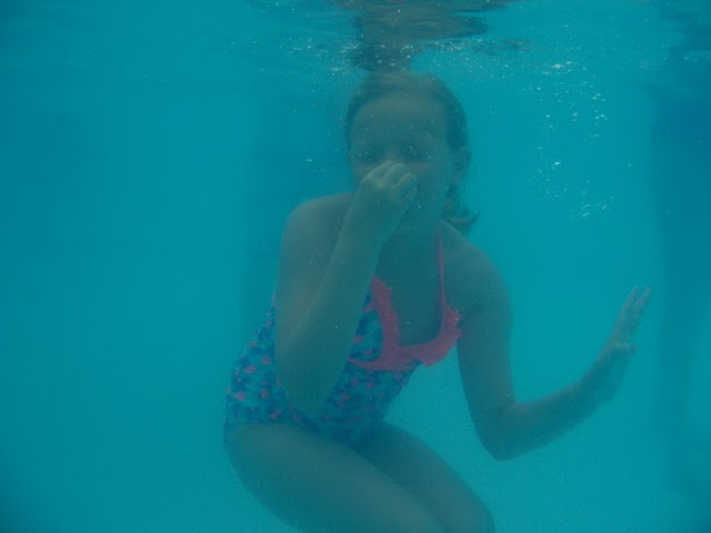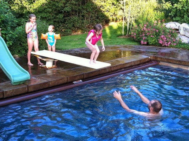 Xander and Mara have been in swim lessons again this summer. Mara has been doing great, but still nervous to use the diving board. So after a lot of bribing, with money and shopping, by Mana & Karri, Mara finally decided it was okay to try it as long as dad was there to catch her.