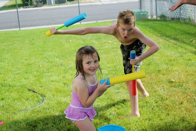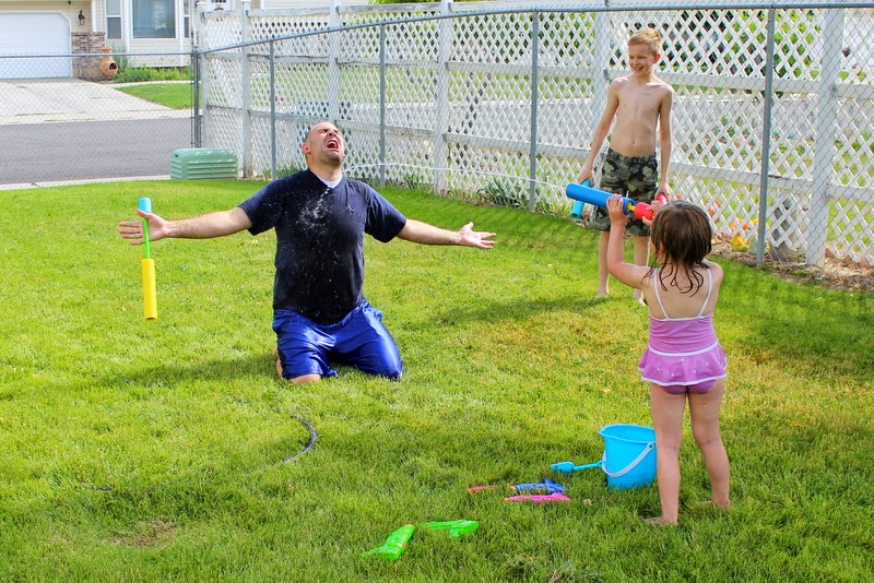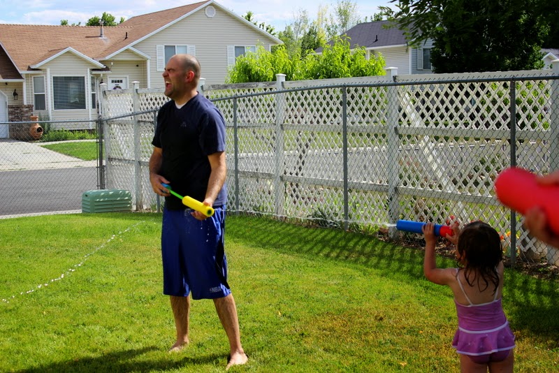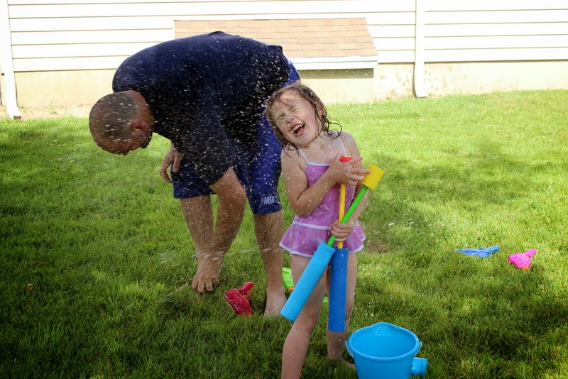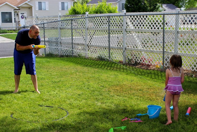 Jaina just always wants to be outside, so Dad and Xander had a water fight with her.