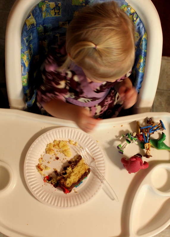 We set her up in the high chair with her cake and toys.