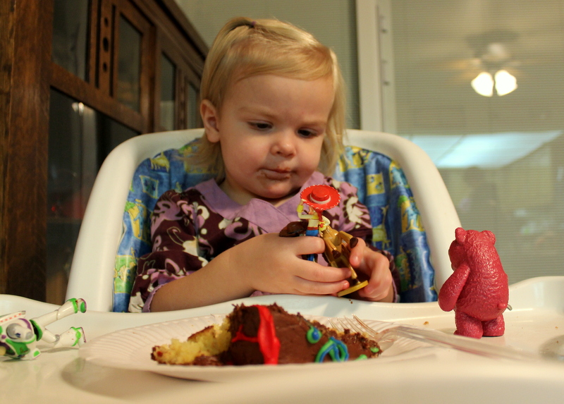 She didn't eat much cake because all she wanted to do was play with her new guys.