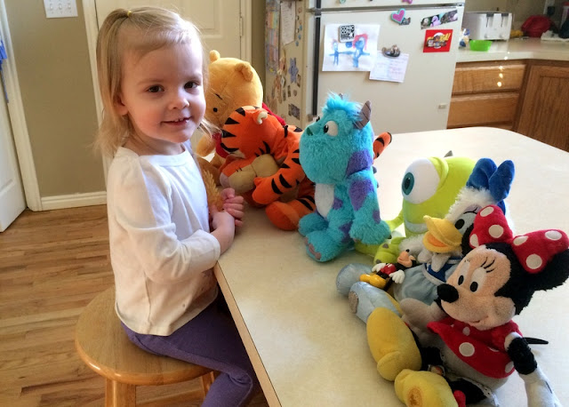 Here's Melody's entourage. Pooh Bear, Tigger, Sulley, Mike, Daisy and Minnie. She loves