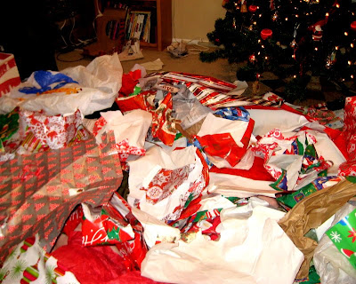 Every year when all the presents have been opened, the kids lay on the floor and we cover them with all the wrapping paper, we take pictures and video, say 'Where are all the kids?"...........