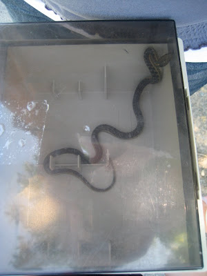 Dad had found a snake at work and decided to bring it home to show the kids. It got out of the box during his drive home and got lost in his car. After a lot of searching, it was found and the box was taped shut this time.